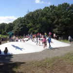 お子様は元気に飛び跳ねれるふわふわドーム、青い人工芝が目にまぶしいソリゲレンデ等様々な遊具、アクテビティで遊べます。