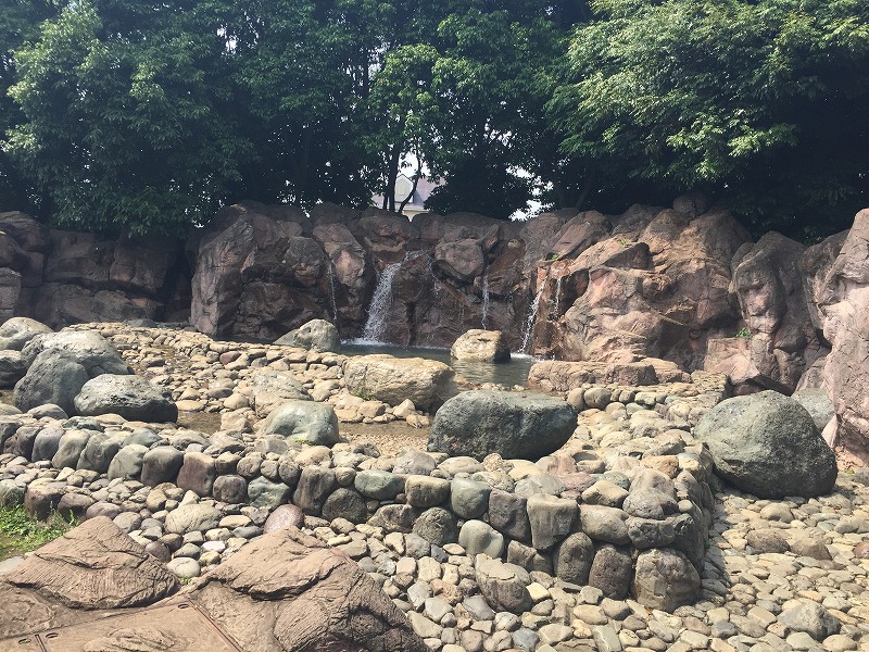 川に小さいけれど、滝が流れているぞ。なんだか、ワクワクするよな。